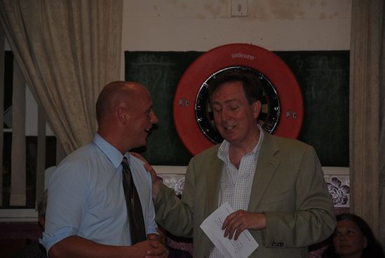 Die Labour Party Blaenau Gwent und die SPD Oberhausen-Rheinhausen nutzten den Pfingstsonntag und damit den zweiten Abend der diesjährigen Wales-Reise des Ortsvereins zum "Social Evening". Dabei stand im "Six Bells Pub" das Feiern im Vordergrund: Die deutschen Genossen hatten die Gewinne ihrer britischen Partner bei den vergangenen Kommunalwahlen einschließlich der Rückeroberung der absoluten Merheit in Blaenau Gwent erfreut verfolgt, während die Labour-Mitglieder bei dem frischen SPD-Erfolg in Nordrhein-Westfalen und der grün-roten Regierungsübernahme in Baden-Württemberg mitgefiebert hatten.
